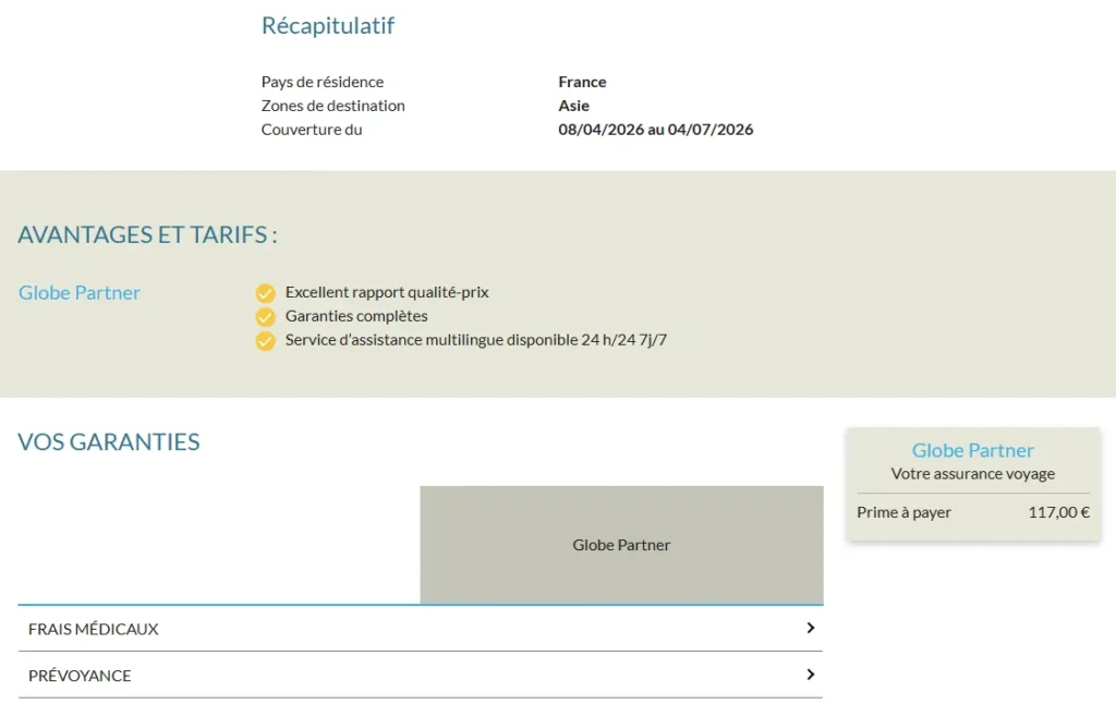 À cette étape, vous retrouvez également les principales garanties incluses dans l’assurance Globe Partner d’ACS (ici la capture d’écran est coupée). C’est aussi ici que vous pouvez vérifier que la couverture correspond bien à votre voyage et ajuster vos dates si nécessaire.