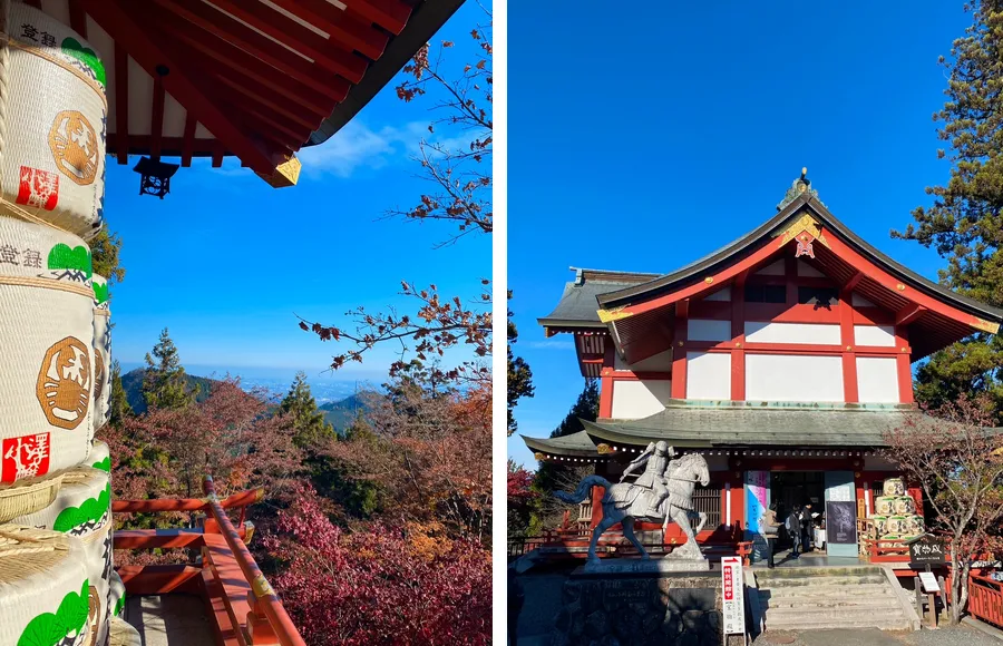 Une fois ce passage effectué, nous avons commencé l’ascension des marches successives qui serpentent entre les arbres. Après plusieurs volées d’escaliers, les deux bâtiments principaux du sanctuaire Musashi-Mitake se sont dévoilés devant nous, imposants et magnifiquement mis en valeur par les couleurs de l’automne.